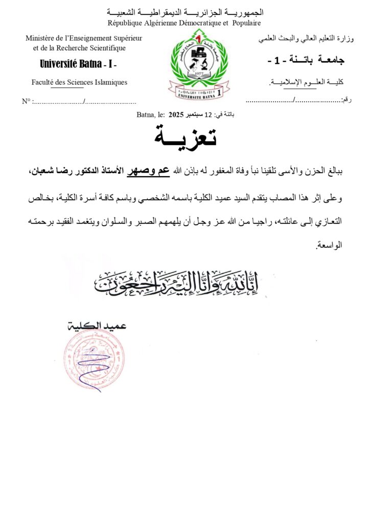 ببالغ الحزن والأسى تلقينا نبأ وفاة المغفور له بإذن الله عم وصهر الأستاذ الدكتور رضا شعبان، وعلى إثر هذا المصاب يتقدم السيد عميد الكلية باسمه الشخصي وباسم كافة أسرة الكلية، بخالص التعازي إلى عائلته، راجيا من الله عز وجل أن يلهمهم الصبر والسلوان ويتغمد الفقيد برحمته الواسعة.