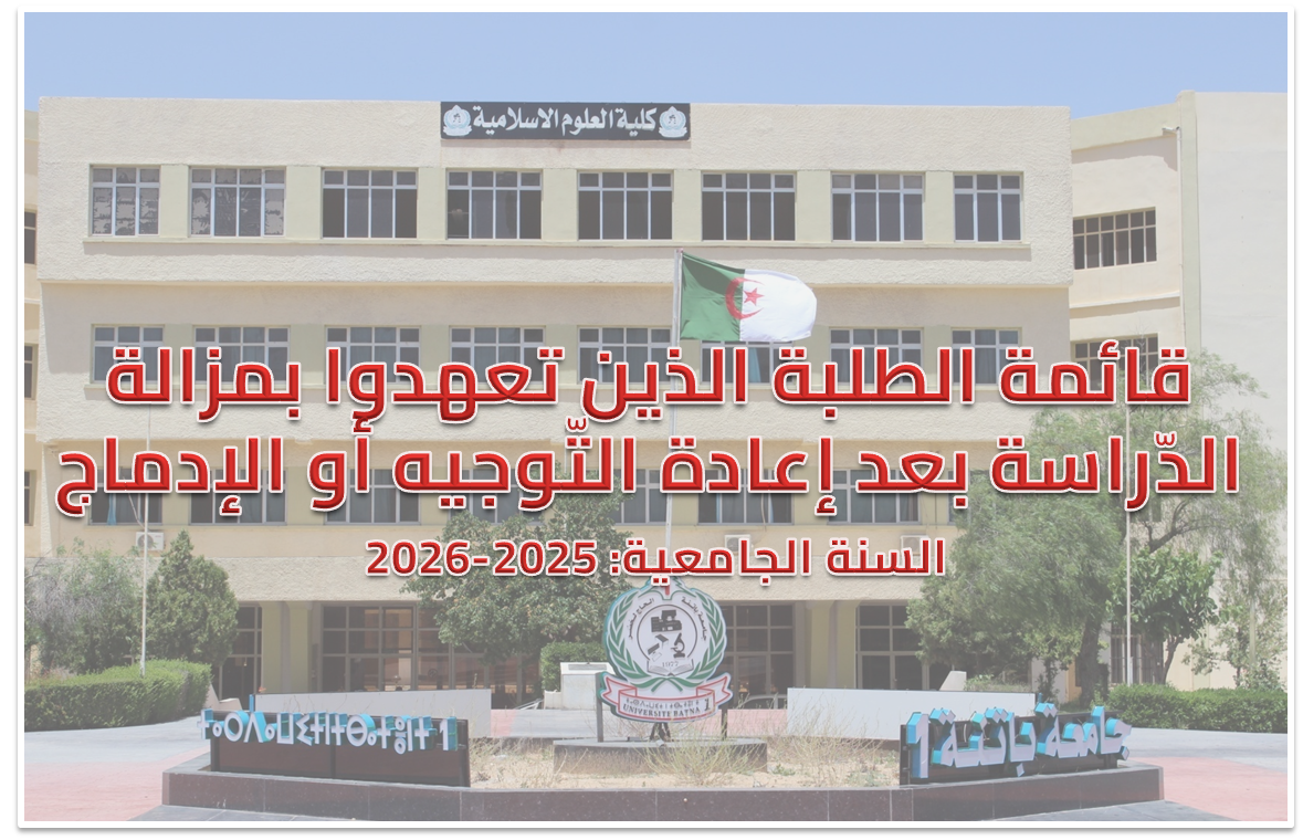 ليكن في علم جميع طلبة العلوم الإسلامية المتمدرسين بكلية اللعوم الإسلامية (مقر جامعة الحاج لخضر)، أنه قد تمت إعادة برمجة الامتحانات التعويضية والاطلاع على الأوراق، يوم الخميس 30 جانفي 2025، بالنسبة للمواد الت كان من المقرر إجراؤها يوم الاثنين 27 جانفي 2025 وذلك وفقا للبرنامج المعلن عن سابقا. تنبيه: إعادة البرمجة خاصة بطلبة الأقسام الثلاثة: